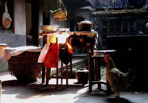 堂屋左側的那間是火爐。里面時刻都有火燒著,被熏的漆黑的樓枕上,吊著兩根長長的鐵鉤,能自由升降,一個鐵鉤上掛著鐵鑄的吊罐,可以煨湯,另一個掛著鋁制的水壺,則用于燒水。到了冬天,火頭就閑不住了,不是熏臘肉,就是燻豆腐干。最難忘的還是大年三十前夕,父親會用樹疙瘩把火爐的火燒得旺旺的,一家人圍坐在火爐邊,家長里短的閑聊。而母親跟外婆卻忙得不亦樂乎,她們在做豆腐、打糍粑、炸麻葉、煮臘肉,準備著第二天豐盛的年夜飯。