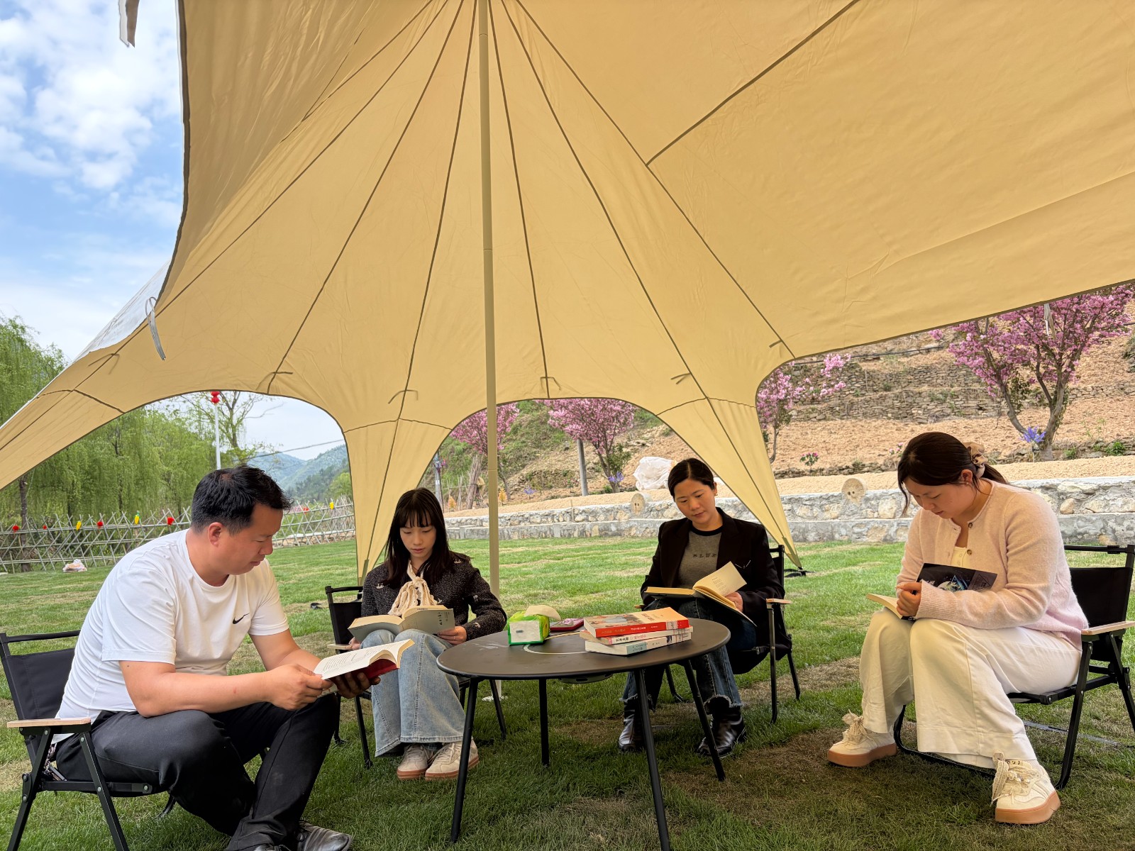 “輕輕的我走了,正如我輕輕地來;我輕輕地招手,作別西天的云彩……”熟悉的詩句在春日的微風(fēng)中徐徐展開。政府年輕干部坐在帳篷下看著從樓臺(tái)鄉(xiāng)文化站挑選的書籍。伴著柳綠花紅,大家在書香中重溫經(jīng)典,在誦讀中感受文字之美、情感之真。