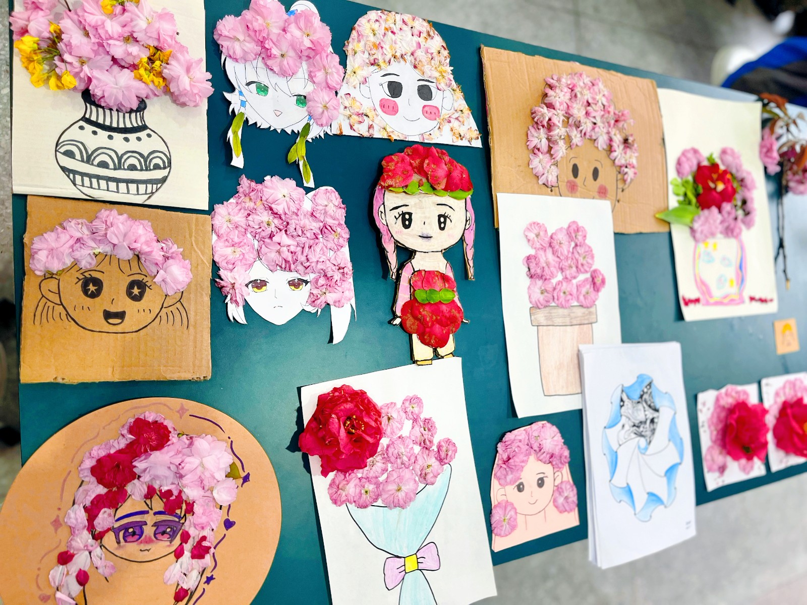 活動現場,樹葉、櫻花等成為創作素材。同學們化身“心靈藝術家”,用彩筆勾勒、剪刀修剪,將花瓣、葉片粘貼成“頭發”“裙擺”等,賦予畫紙新生命。有的用三葉草拼短發,有的用粉櫻做卷發,還有組合成花瓶造型,作品充滿童趣與巧思,藏著情緒表達。創作中,孩子們專注投入,緊張情緒漸消,歡聲笑語不斷。