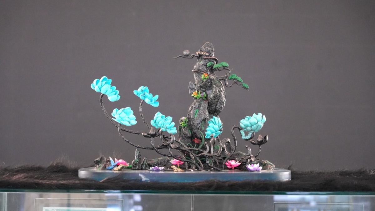“你看這件作品,從這邊一陣風吹過來,每一朵荷花都很飄逸,底座的山形有回風,所以挨著的兩朵荷花它的朝向也往這邊走,形成一個呼應。”綠松石雕刻師秦黎鵬說。