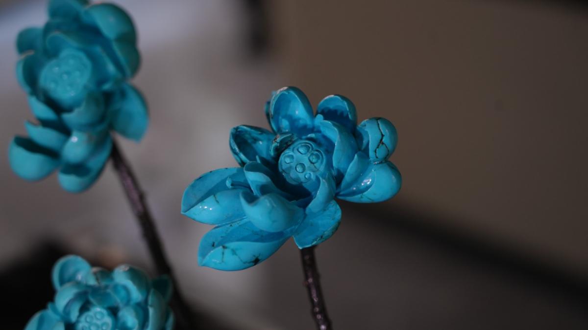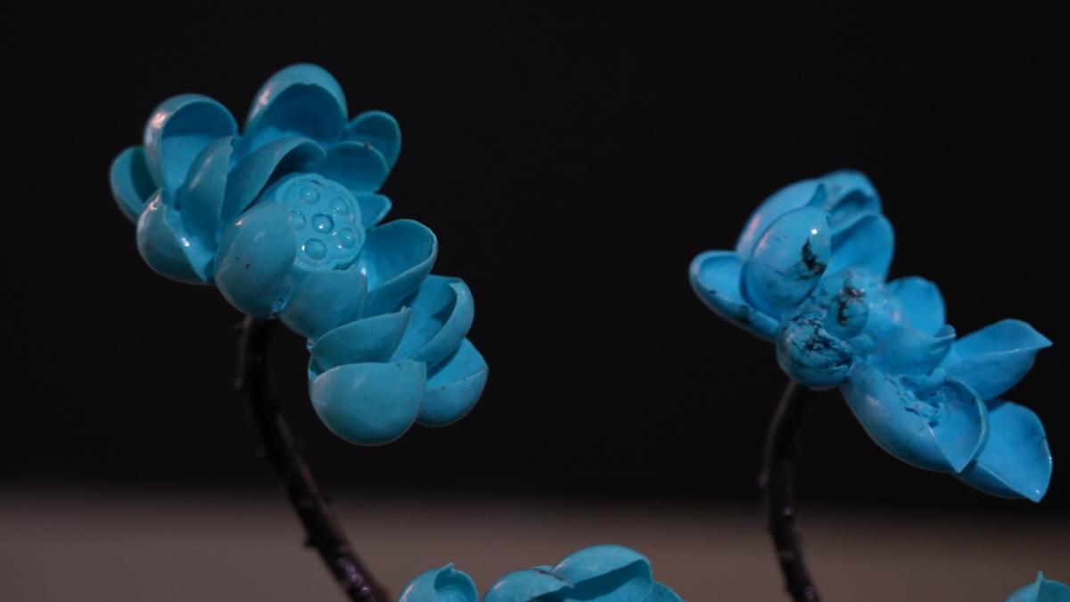 “綠松石是一個水性的寶石,在水里面它的顏色可能非常漂亮,但是晾干拋光之后,顏色會有出入。”秦黎鵬介紹,在做這件作品的時候,實際上是有16朵荷花,但做出來只有6朵能把綠松石的顏色和荷花的自然美體現出來。